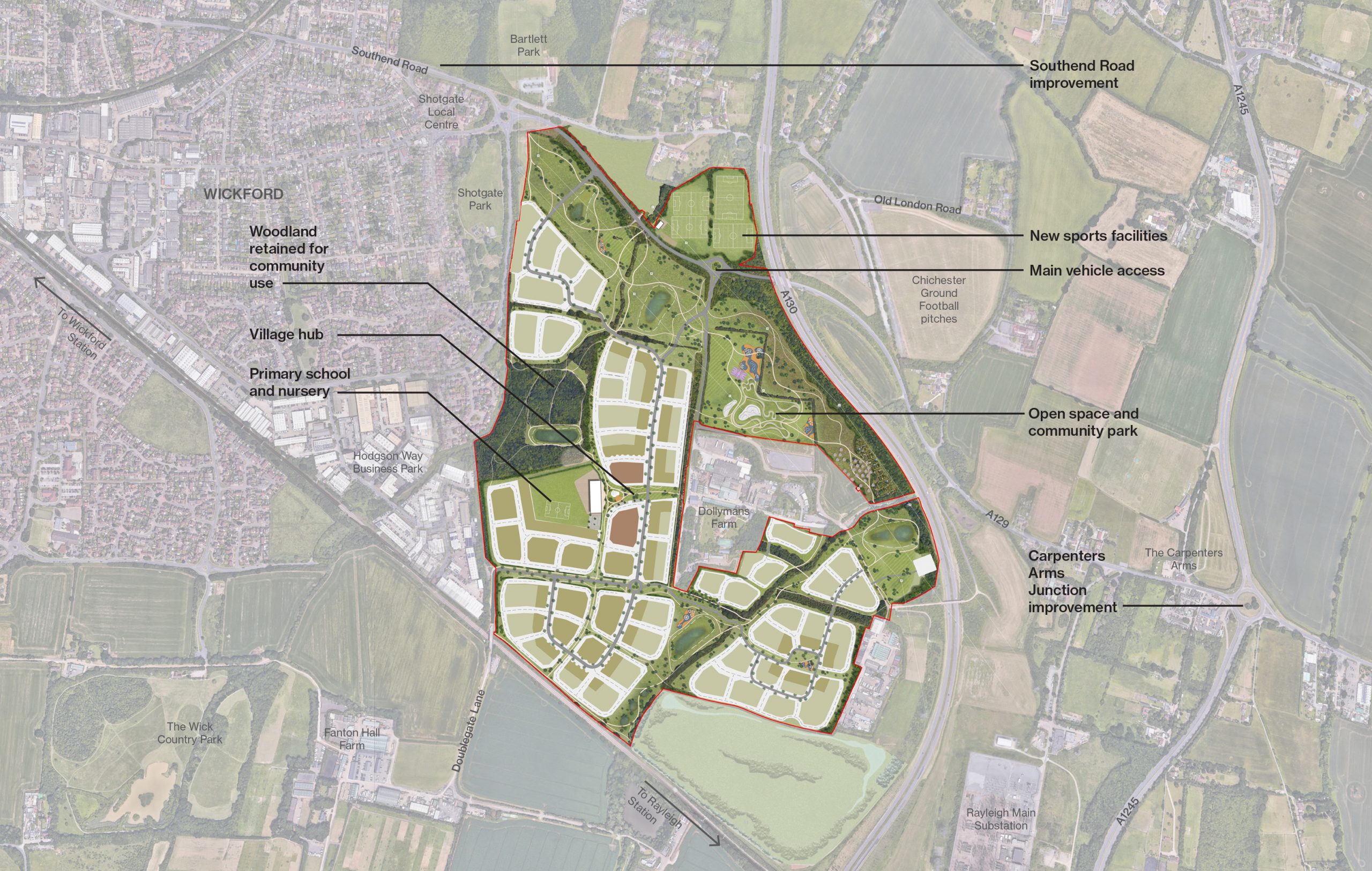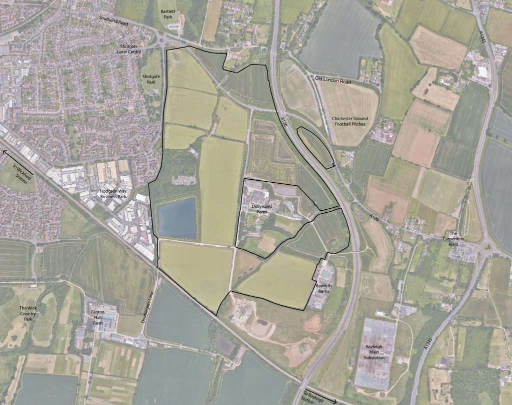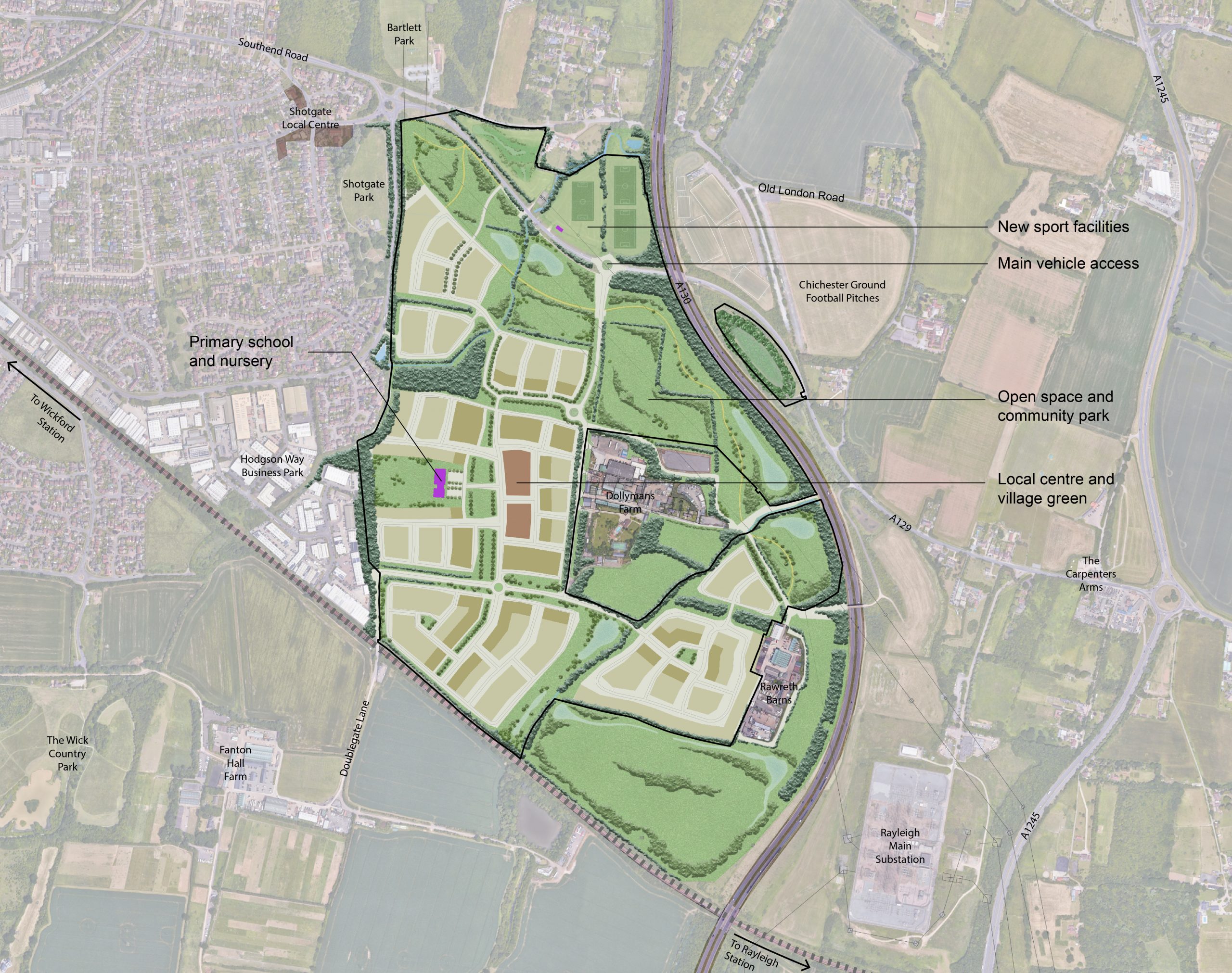 Located to the east of Wickford (Shotgate) and west of the A130, this site is strategically located to deliver a walkable new neighbourhood with homes, local centre, primary school and other facilities in a sustainable location. There are around 8 hectares of established employment uses already on site and a wide range of job opportunities close by at Wickford Business Park, in Wickford Town Centre, Rayleigh and Fanton Hall Farm.