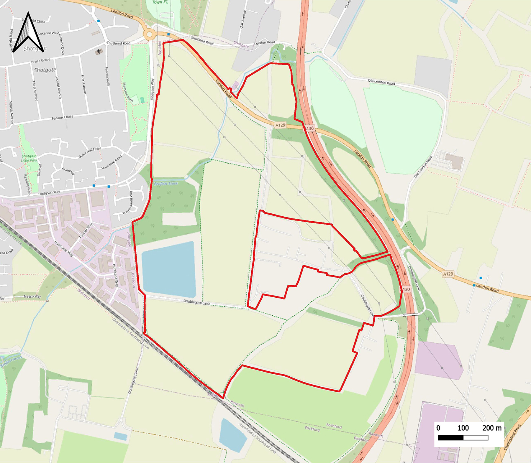 A: Access is proposed off the A129 Southend Road in two places; firstly, at the existing junction with Doublegate Lane in the form of a roundabout junction that will replace the existing junction arrangement, a smaller secondary access will provide access to a limited portion of the site between the existing Pegasus crossing and the Hodgson Way roundabout. The secondary access will be a priority junction and allow for emergency access for the whole development, if required. There will be no access to Hodgson Way.